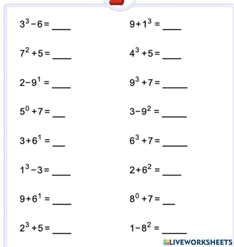Web exponents worksheets for students address subjects including exponents in expressions and equations, negative exponents, and powers in an effort to help students better. For example, 6 3 just indicates that we multiply 6 by itself 3 times or 6 x 6 x 6. 22 + 7 = _____ b.